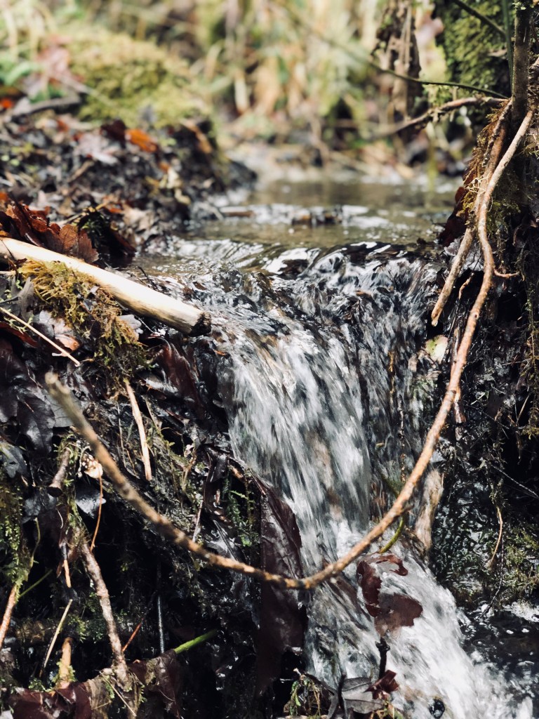 But that’s when I noticed my dog Maggie sniffing at a small rivulet alongside the logging road. All morning as we hiked up into the Coast Range I studied the rain and snowmelt forming pools, puddles and little nascent streams. And all those small riffles and trickles and seeps seemed so random, so aimless.