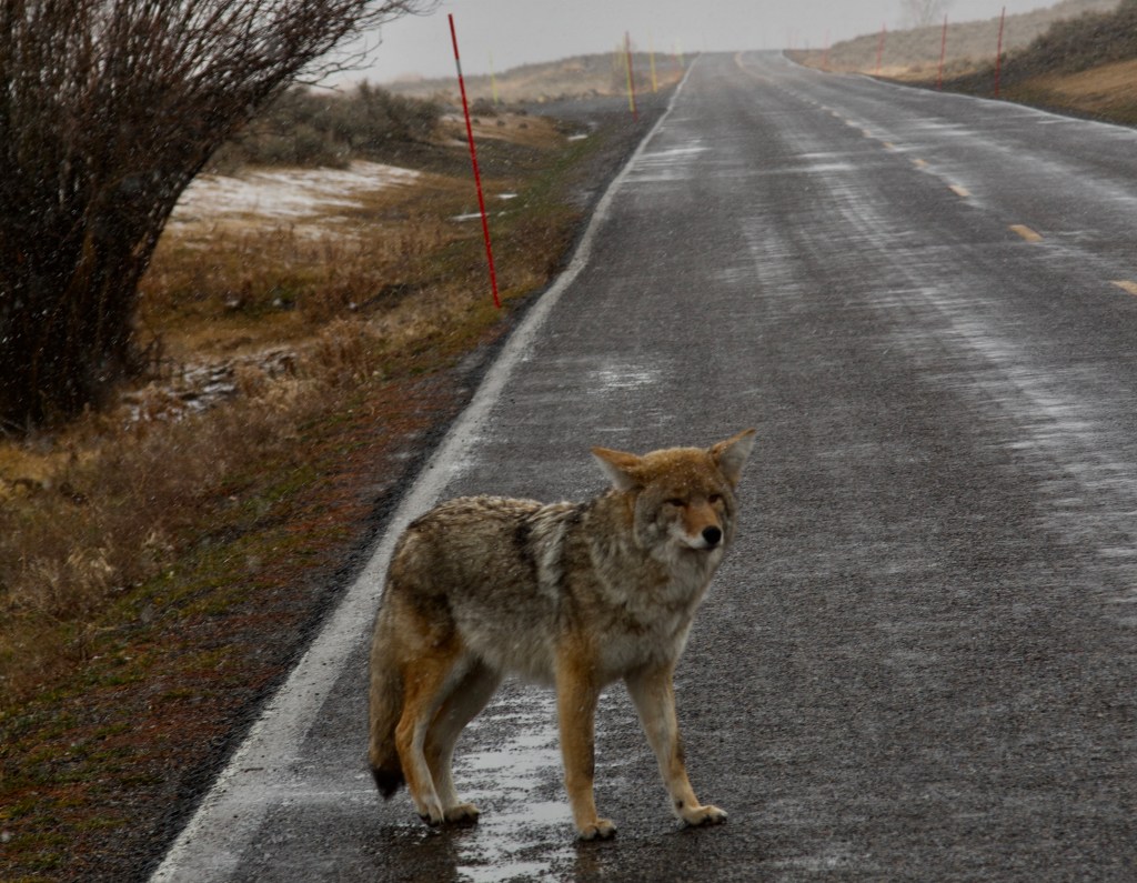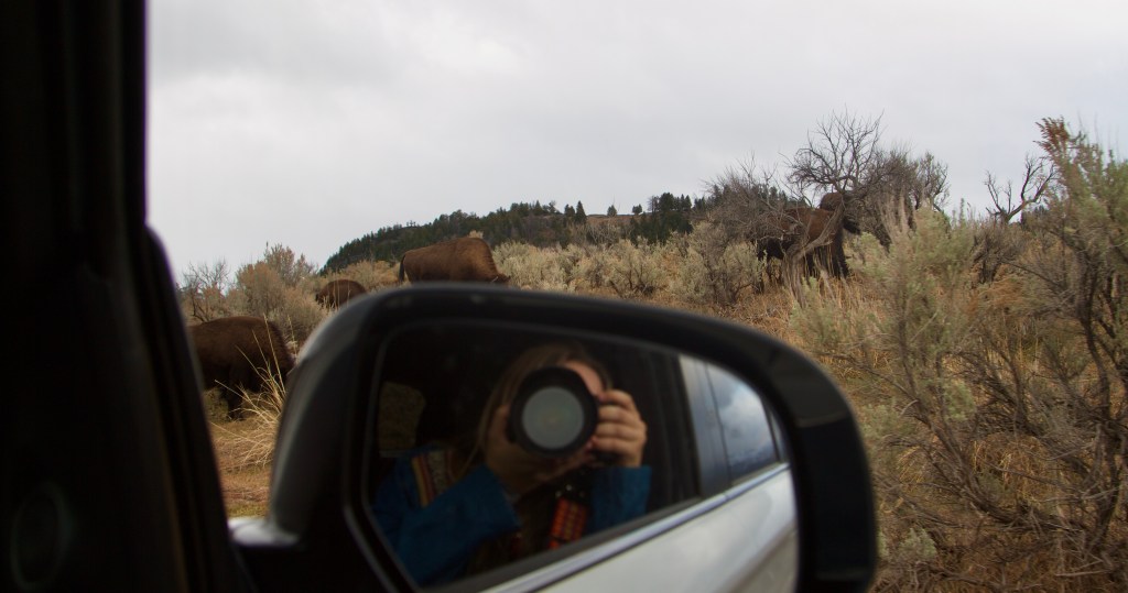 …and as Bailey leaned out to make photos of insouciant bison and a coyote with a game leg and hungry stare, the industrial and primordial ecosystems merged, herds converging—camera-wielding vultures and wooly beasts—in a land of tarmac and steaming meadows poised for the uncertainty of winter.